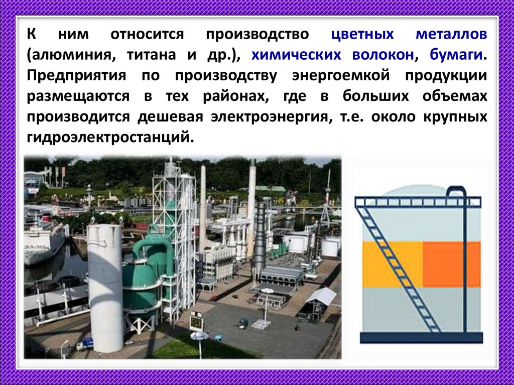 К ним относится производство цветных металлов(алюминия, титана и др.), химических волокон, бумаги.