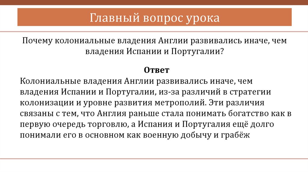 Главный вопрос урокаПочему колониальные владения Англии развивались иначе, чем