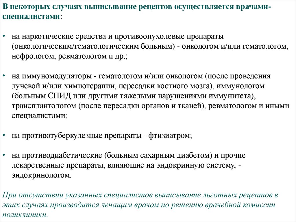 В некоторых случаях выписывание рецептов осуществляется врачамиспециалистами:• на наркотические средства и противоопухолевые препараты