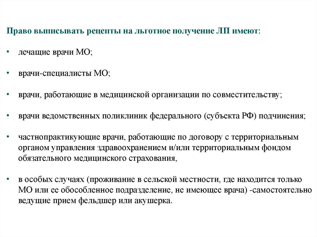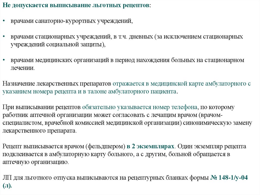 Не допускается выписывание льготных рецептов:• врачами санаторно-курортных учреждений,