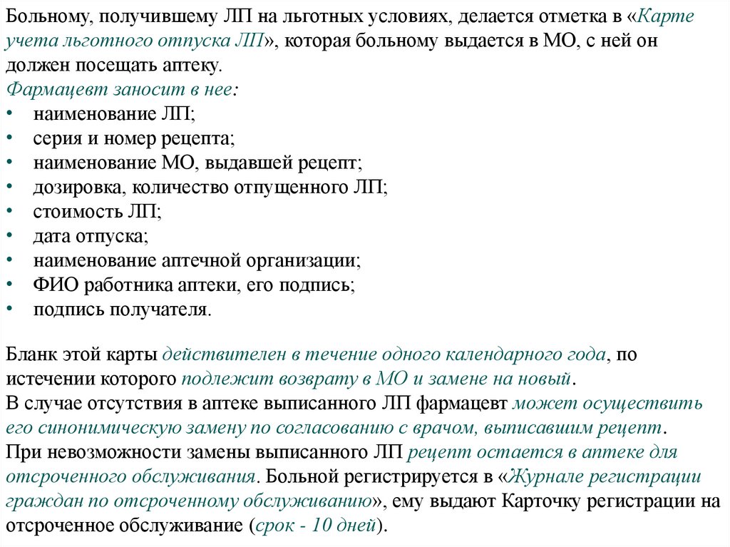 Больному, получившему ЛП на льготных условиях, делается отметка в «Картеучета льготного отпуска ЛП», которая больному выдается в МО, с ней он
