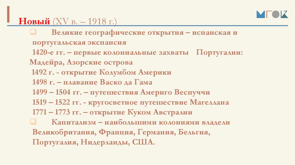 Новый (XV в. – 1918 г.)Великие географические открытия – испанская и