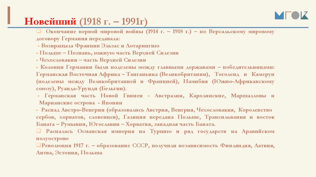 Новейший (1918 г. – 1991г)Окончание первой мировой войны (1914 г. – 1918 г.) – по Версальскому мировому