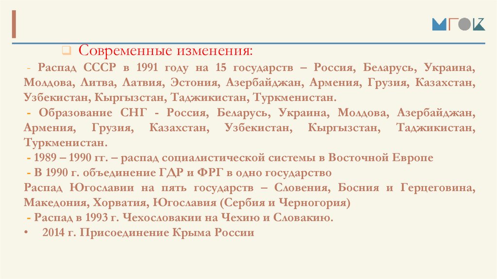 Современные изменения:- Распад СССР в 1991 году на 15 государств – Россия, Беларусь, Украина,