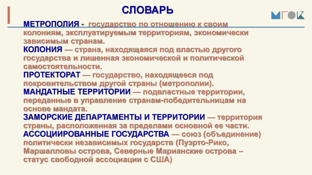 СЛОВАРЬМЕТРОПОЛИЯ - государство по отношению к своим
