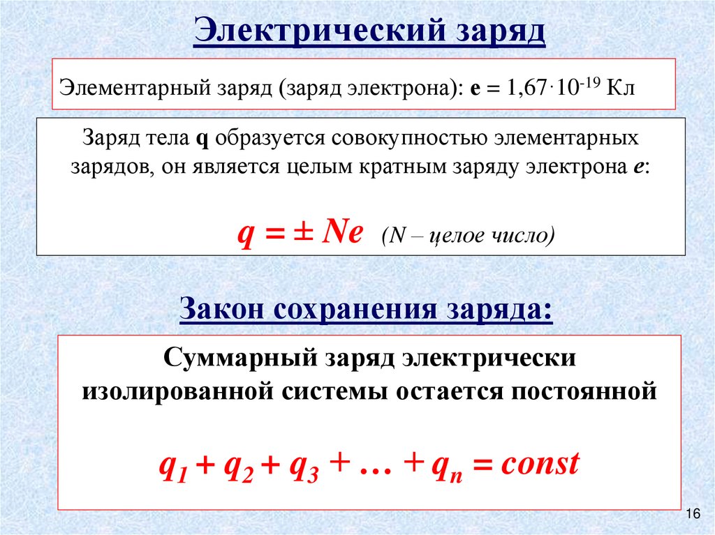 Электрический зарядЭлементарный заряд (заряд электрона): е = 1,67·10-19 Кл