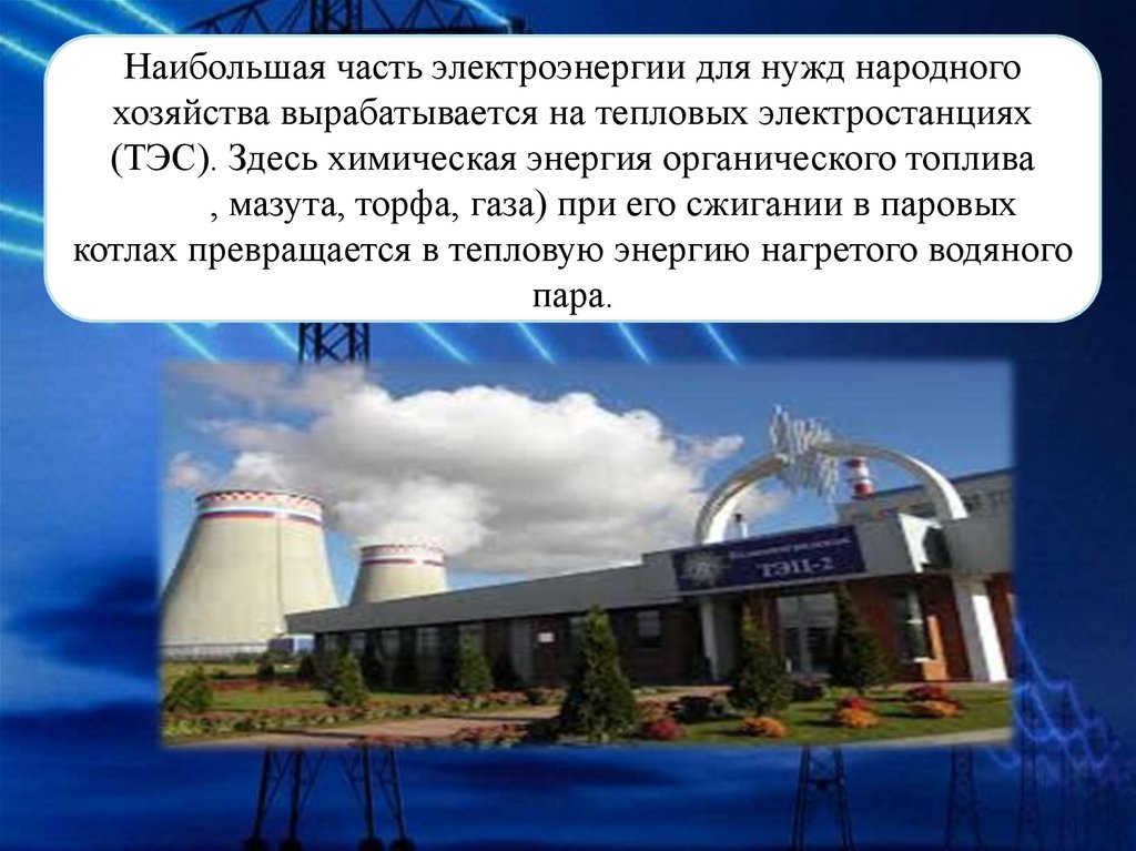 Наибольшая часть электроэнергии для нужд народногохозяйства вырабатывается на тепловых электростанциях