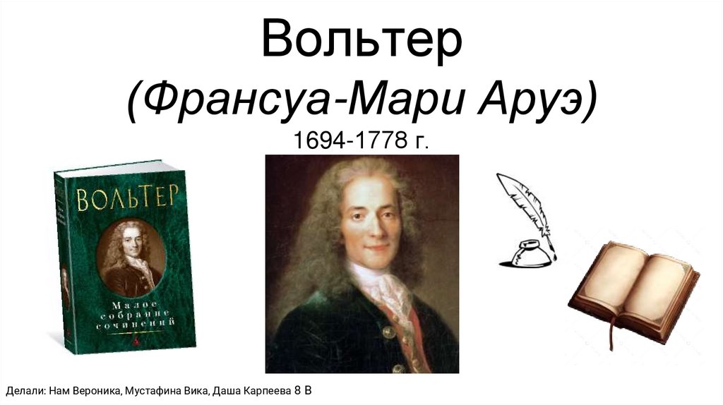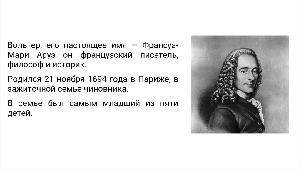 Вольтер, его настоящее имя — ФрансуаМари Аруэ он французский писатель,философ и историк.