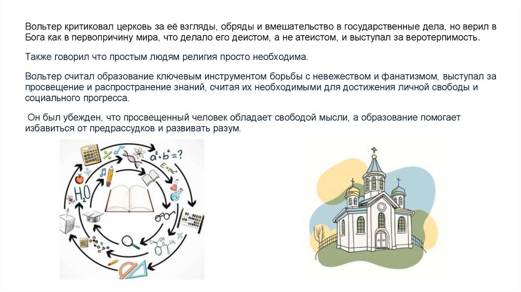 Вольтер критиковал церковь за её взгляды, обряды и вмешательство в государственные дела, но верил вБога как в первопричину мира, что делало его деистом, а не атеистом, и выступал за веротерпимость.
