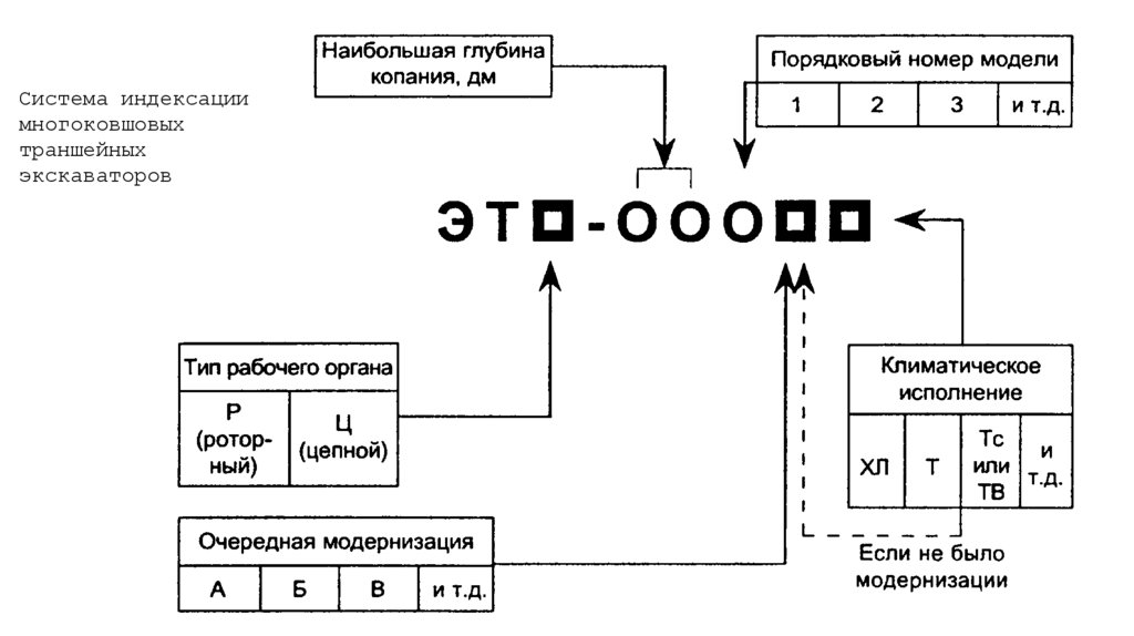 Например, индекс ЭТЦ-252А обозначает: экскаватор траншейный цепной,