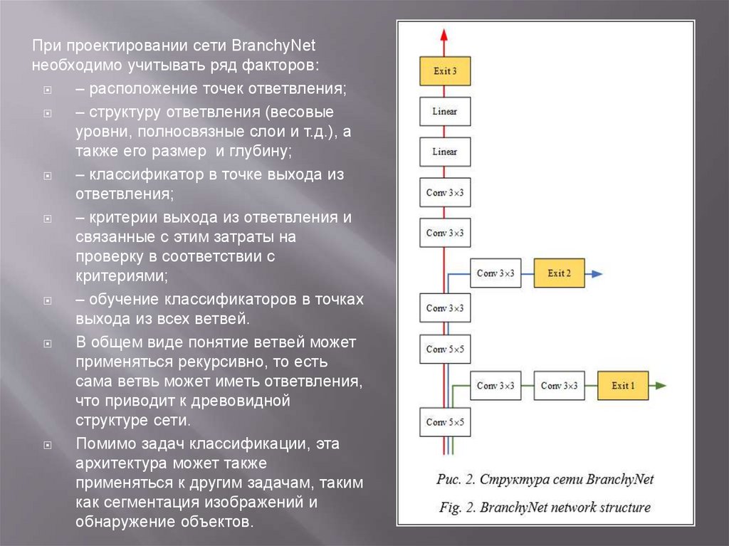 В архитектуре нейронной сети BranchyNet к основной ветви исходнойнейросети добавляются боковые ветви для обеспечения раннего выхода на
