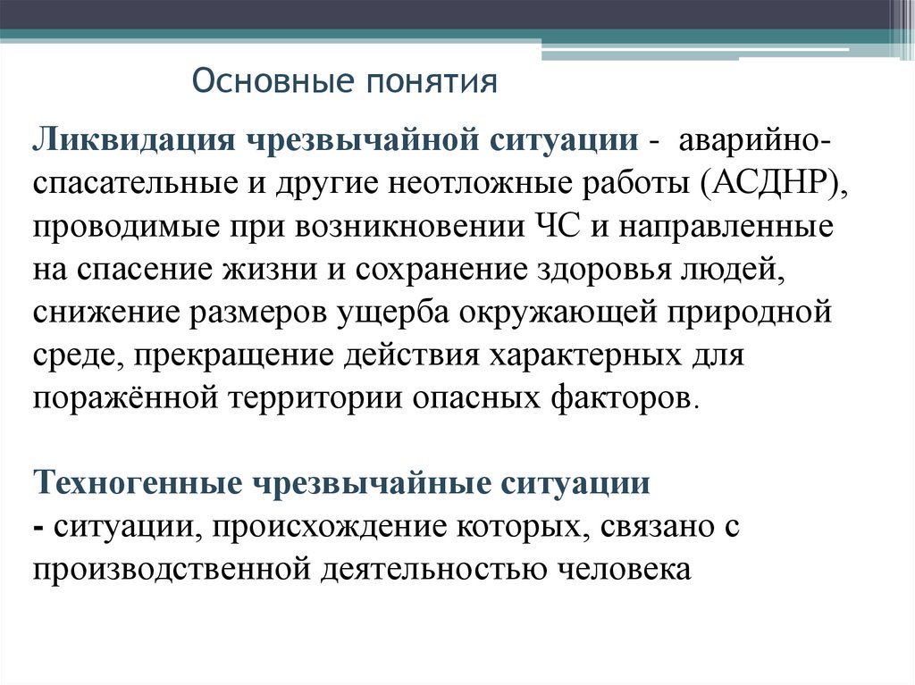 Основные понятияЛиквидация чрезвычайной ситуации - аварийноспасательные и другие неотложные работы (АСДНР),