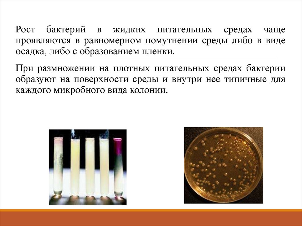 Рост бактерий в жидких питательных средах чащепроявляются в равномерном помутнении среды либо в виде
