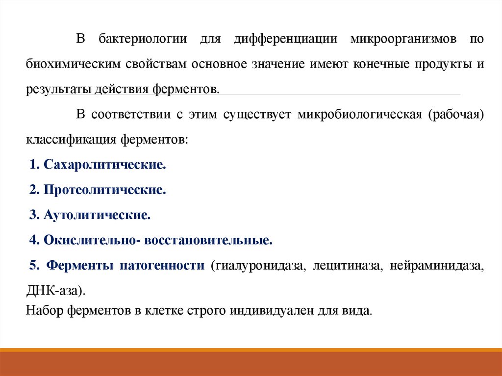 В бактериологии для дифференциации микроорганизмов побиохимическим свойствам основное значение имеют конечные продукты и