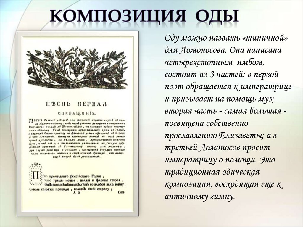 Оду можно назвать «типичной»для Ломоносова. Она написана