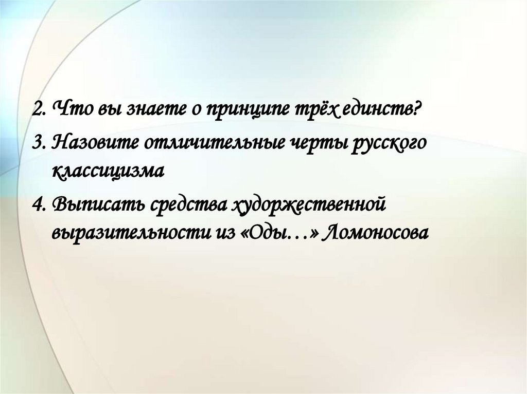 2. Что вы знаете о принципе трёх единств?3. Назовите отличительные черты русского