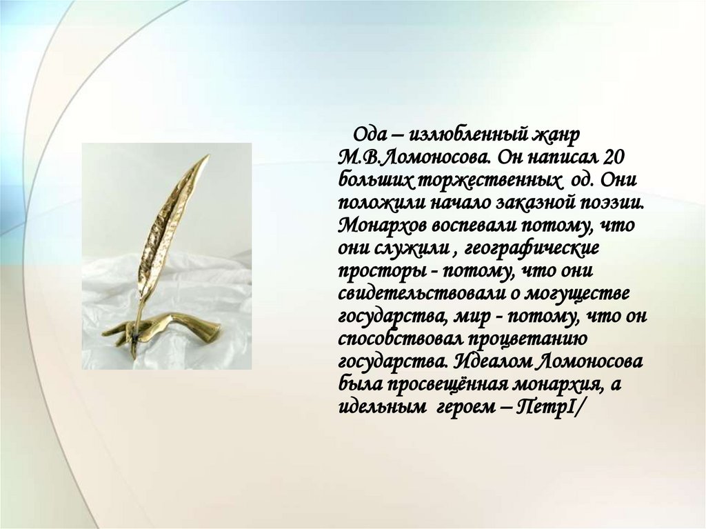 Ода – излюбленный жанрМ.В.Ломоносова. Он написал 20