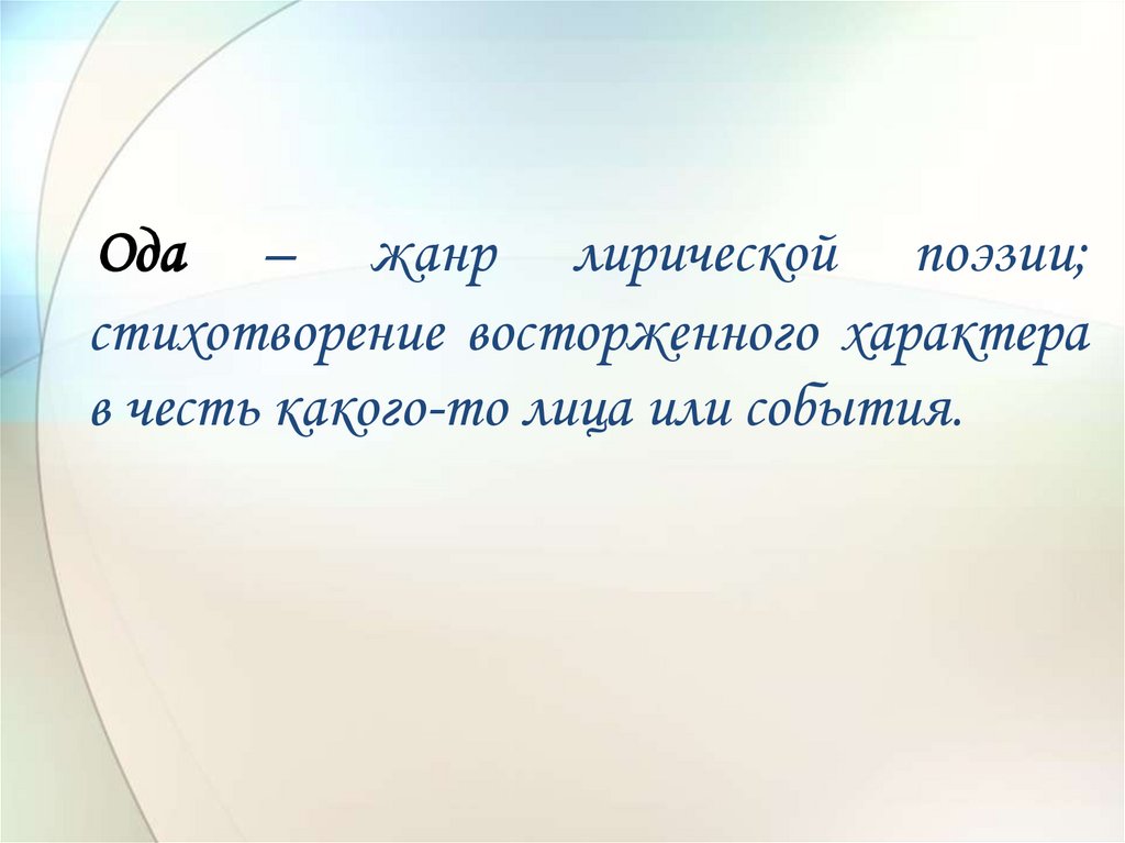 Ода – жанр лирической поэзии;стихотворение восторженного характера