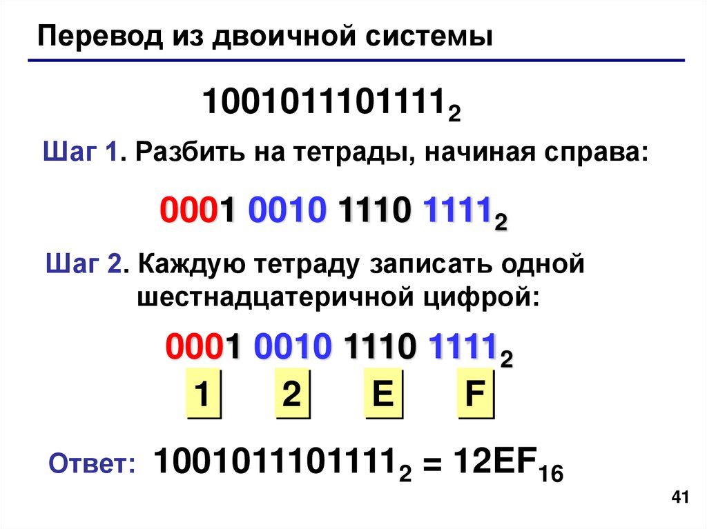 Ответ: 10010111011112 = 12EF16