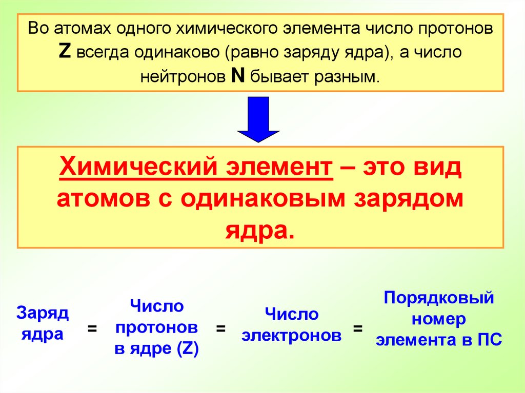 Во атомах одного химического элемента число протоновZ всегда одинаково (равно заряду ядра), а число