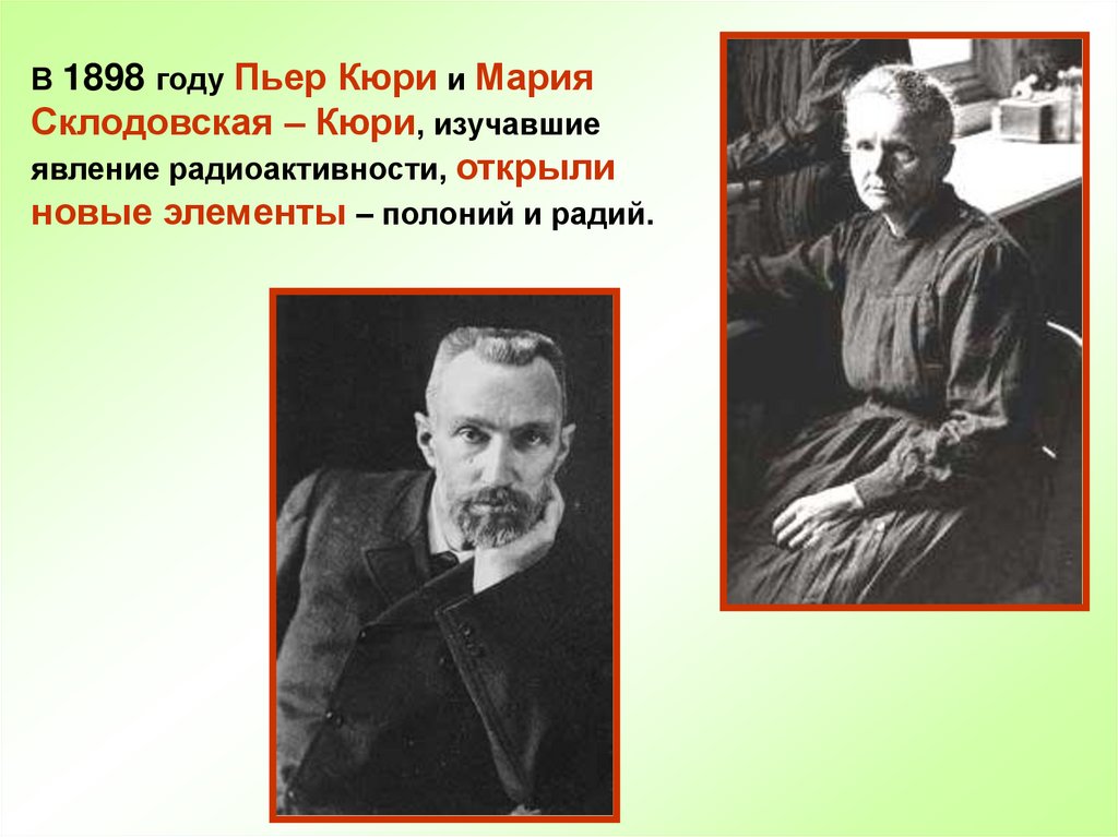 В 1898 году Пьер Кюри и МарияСклодовская – Кюри, изучавшие