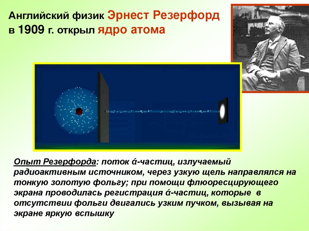 Английский физик Эрнест Резерфордв 1909 г. открыл ядро атома