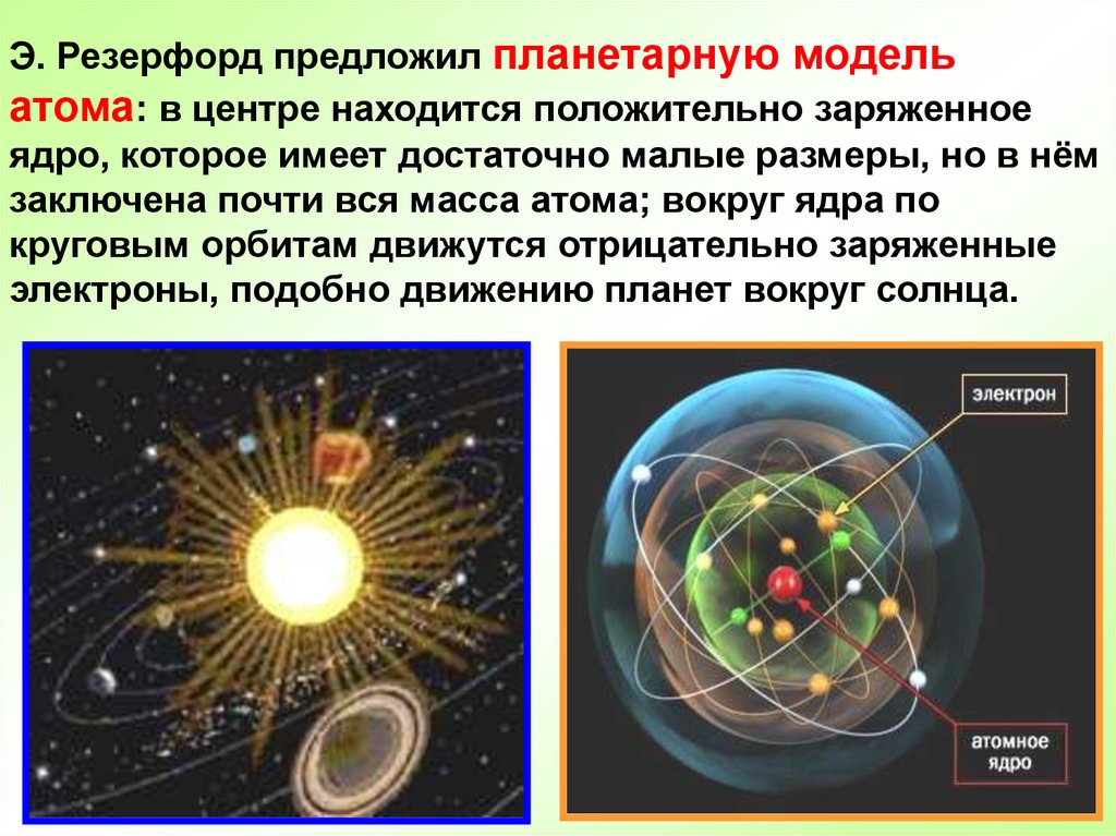 Э. Резерфорд предложил планетарную модельатома: в центре находится положительно заряженное