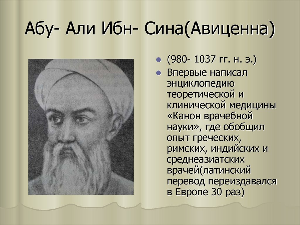 Абу- Али Ибн- Сина(Авиценна)(980- 1037 гг. н. э.)