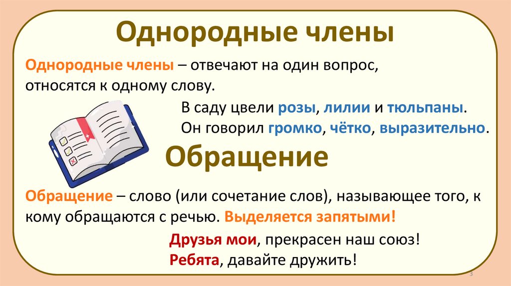 Однородные членыОднородные члены – отвечают на один вопрос,
