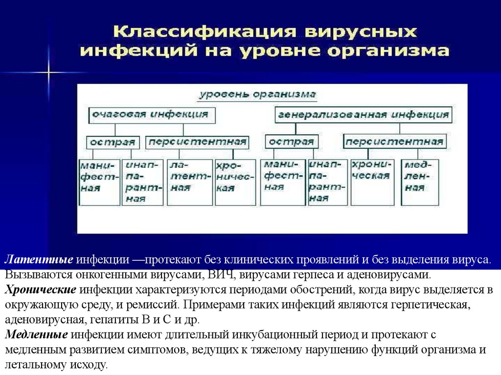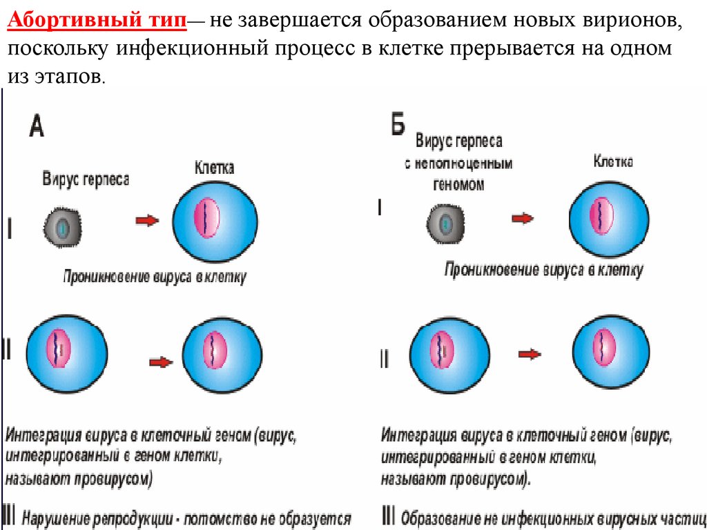 Латентные инфекции —протекают без клинических проявлений и без выделения вируса.Вызываются онкогенными вирусами, ВИЧ, вирусами герпеса и аденовирусами.