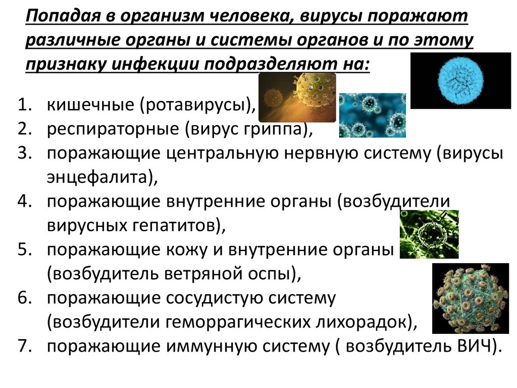 Попадая в организм человека, вирусы поражаютразличные органы и системы органов и по этому