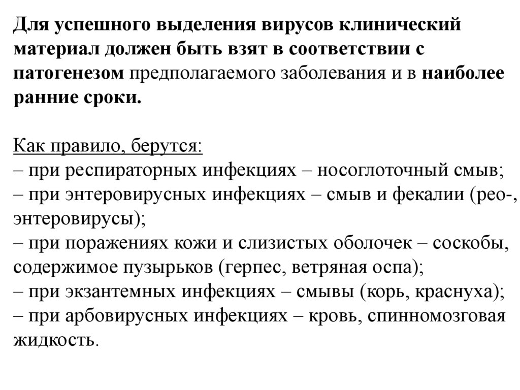 Для успешного выделения вирусов клиническийматериал должен быть взят в соответствии с