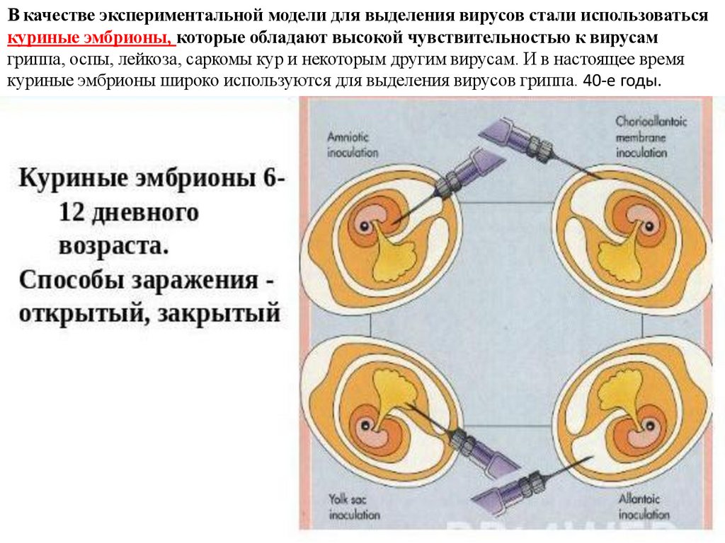 В качестве экспериментальной модели для выделения вирусов стали использоватьсякуриные эмбрионы, которые обладают высокой чувствительностью к вирусам