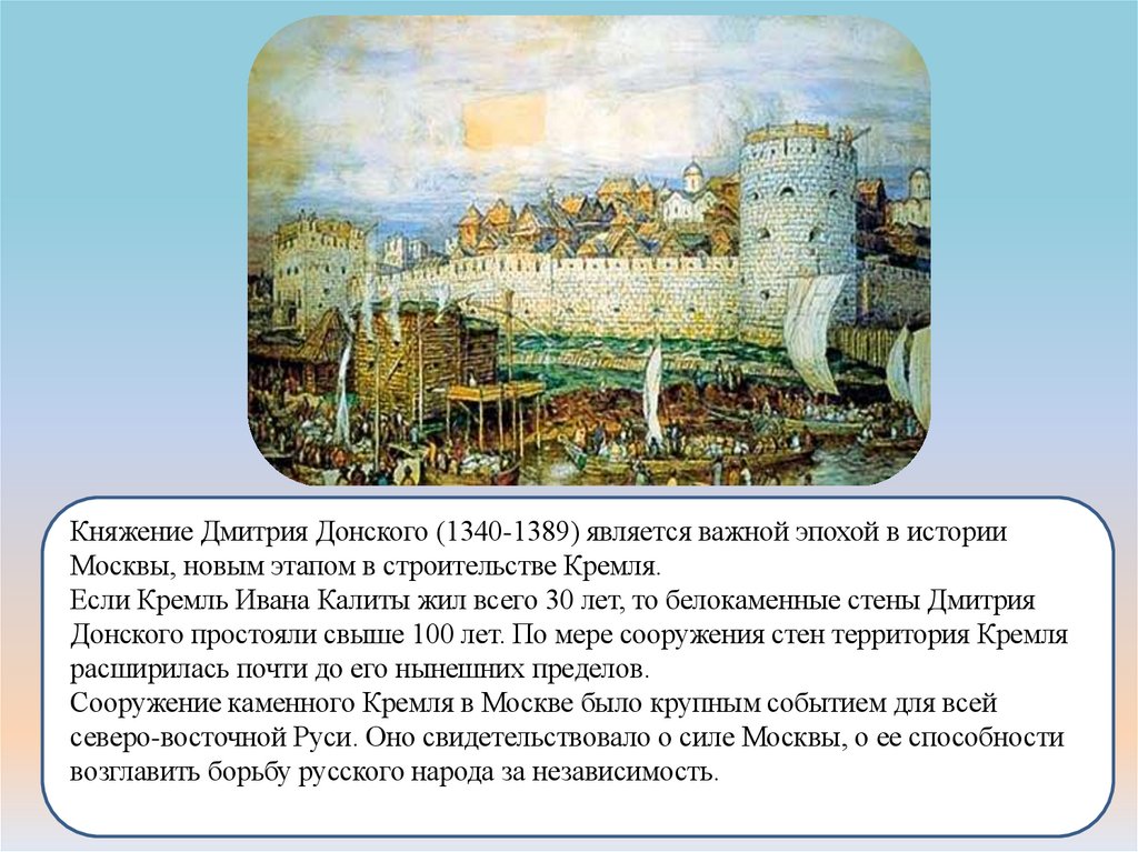 Княжение Дмитрия Донского (1340-1389) является важной эпохой в историиМосквы, новым этапом в строительстве Кремля.