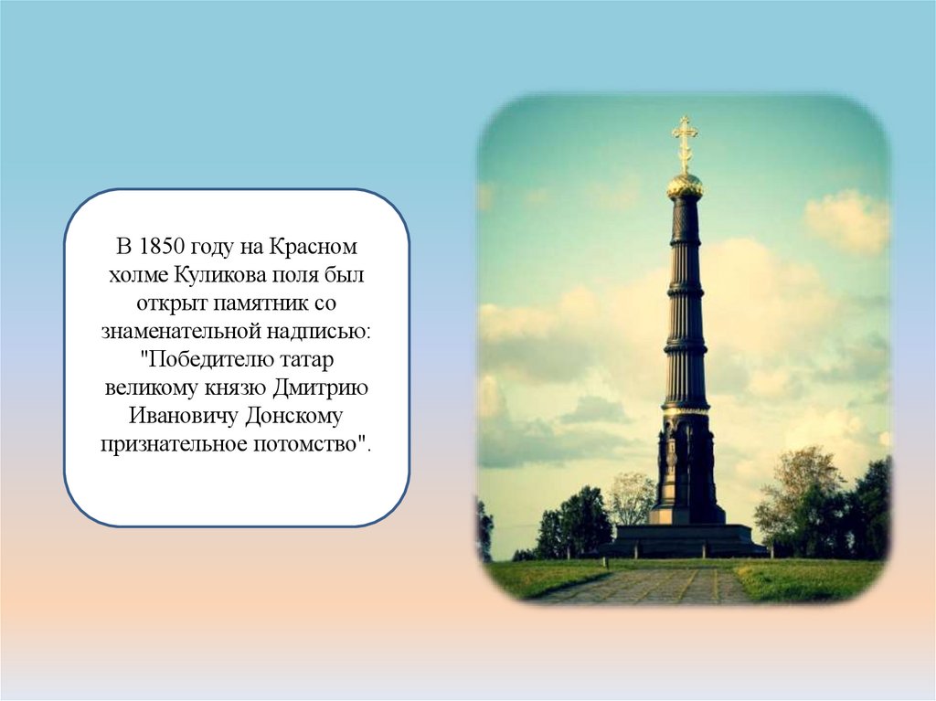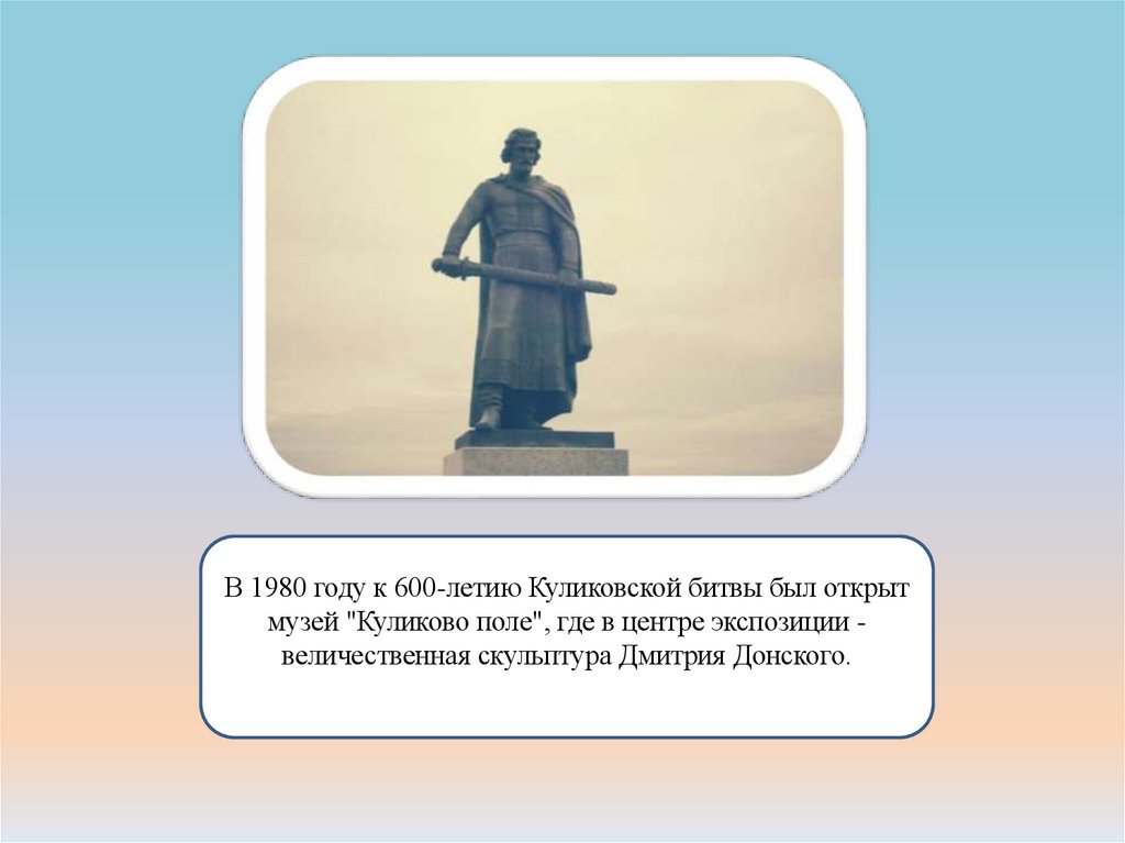 В 1980 году к 600-летию Куликовской битвы был открытмузей "Куликово поле", где в центре экспозиции величественная скульптура Дмитрия Донского.