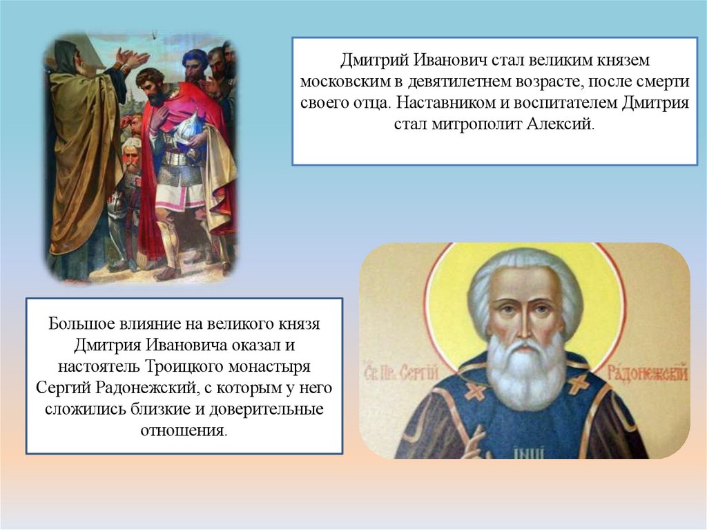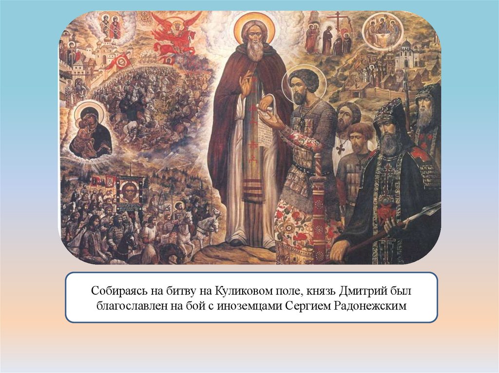 Собираясь на битву на Куликовом поле, князь Дмитрий былблагославлен на бой с иноземцами Сергием Радонежским