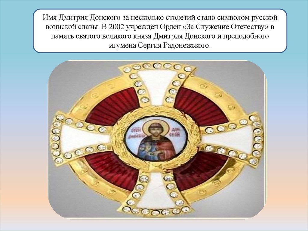 Имя Дмитрия Донского за несколько столетий стало символом русскойвоинской славы. В 2002 учреждён Орден «За Служение Отечеству» в