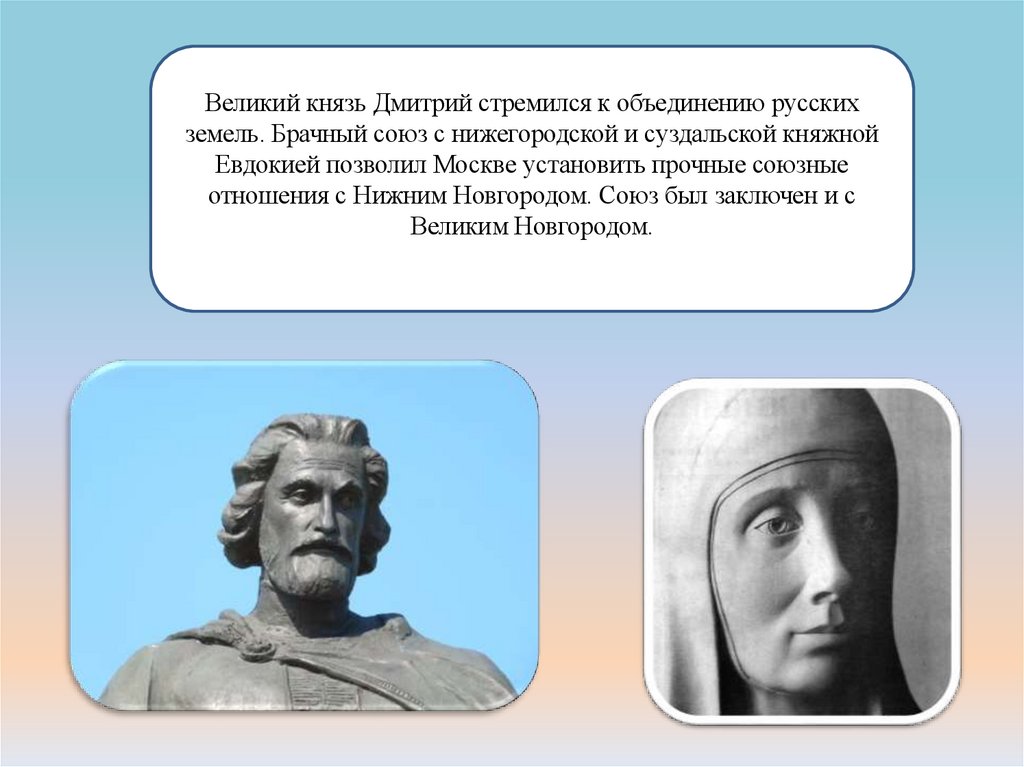 Великий князь Дмитрий стремился к объединению русскихземель. Брачный союз с нижегородской и суздальской княжной