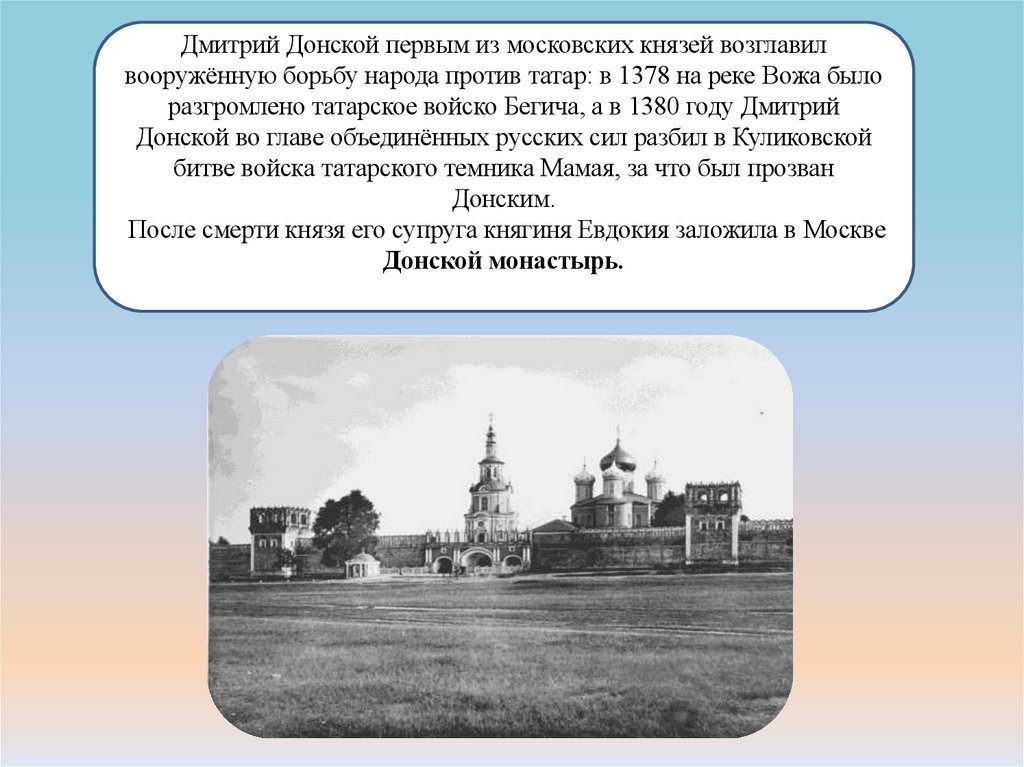Дмитрий Донской первым из московских князей возглавилвооружённую борьбу народа против татар: в 1378 на реке Вожа было