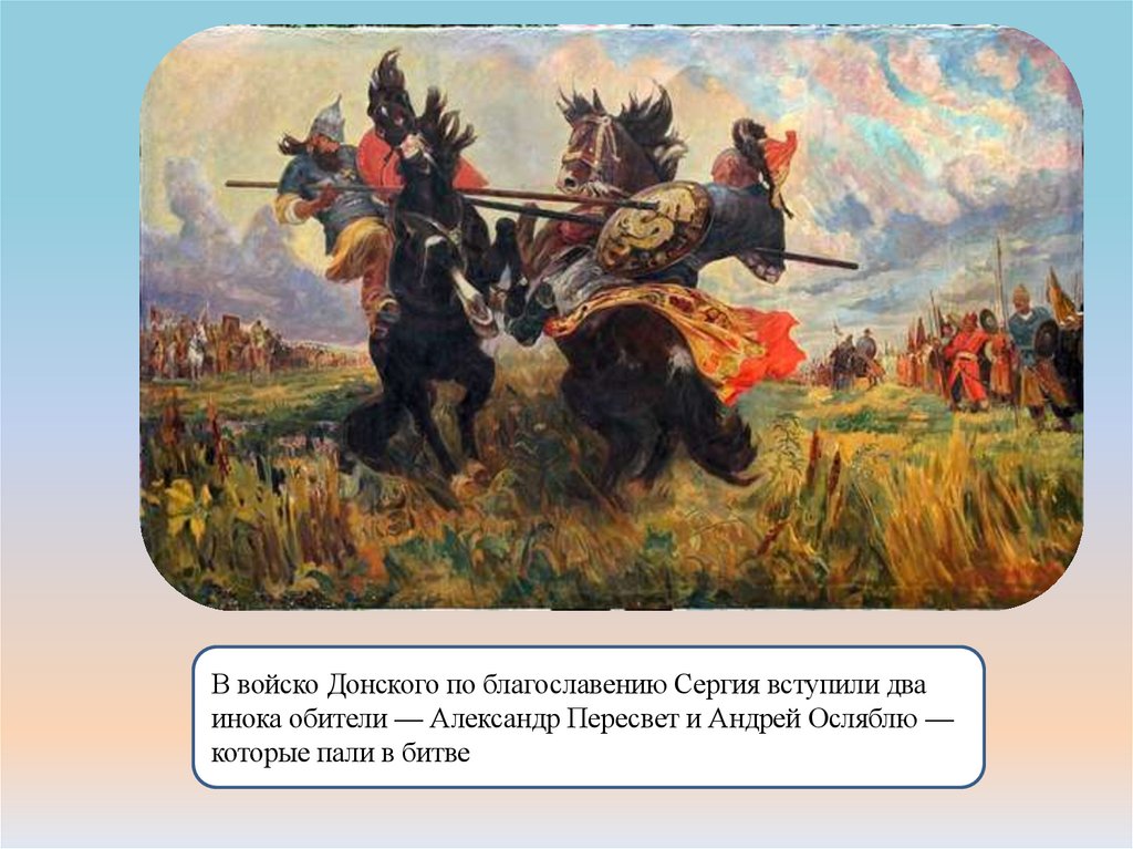 В войско Донского по благославению Сергия вступили дваинока обители — Александр Пересвет и Андрей Осляблю —