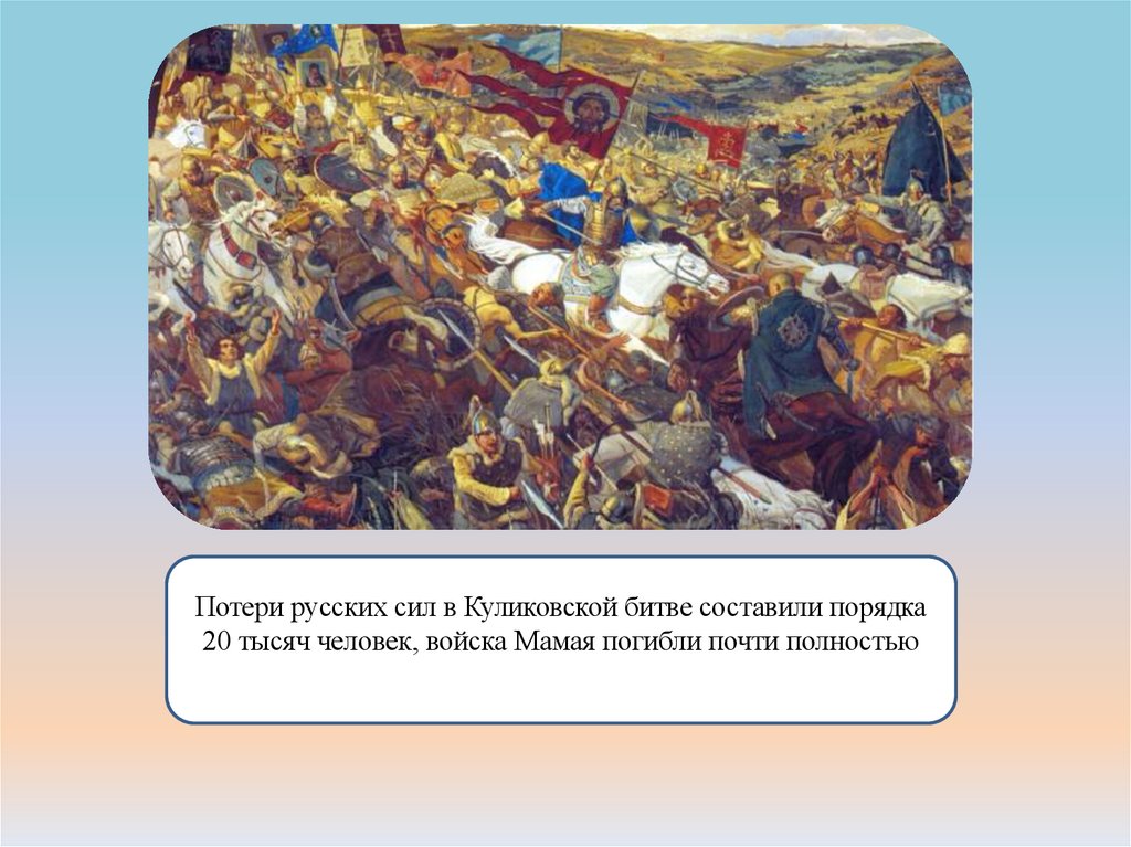 Потери русских сил в Куликовской битве составили порядка20 тысяч человек, войска Мамая погибли почти полностью