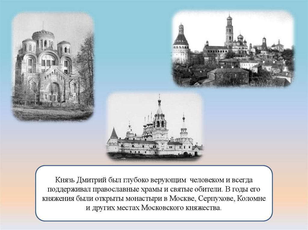 Князь Дмитрий был глубоко верующим человеком и всегдаподдерживал православные храмы и святые обители. В годы его