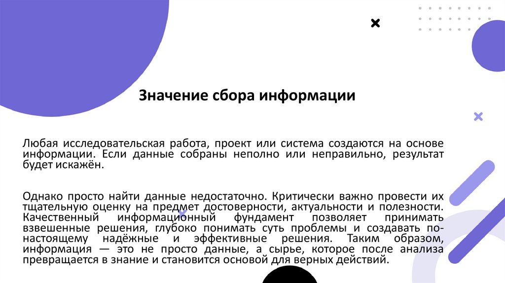 Значение сбора информацииЛюбая исследовательская работа, проект или система создаются на основе