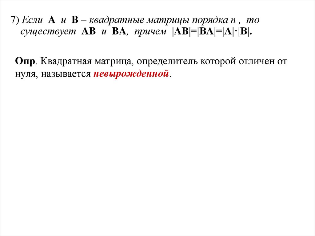 7) Если A и B – квадратные матрицы порядка n , тосуществует AB и BA, причем |AB|=|BA|=|A|·|B|.