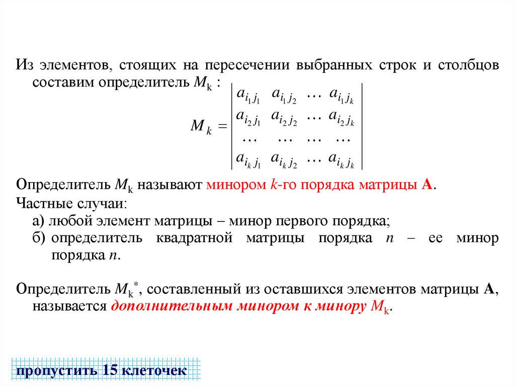 Определитель Mk называют минором k-го порядка матрицы A.