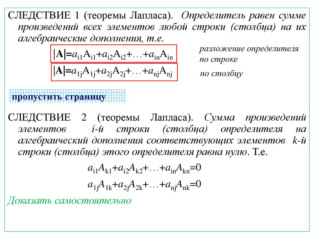 СЛЕДСТВИЕ 1 (теоремы Лапласа). Определитель равен суммепроизведений всех элементов любой строки (столбца) на их