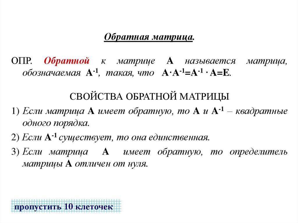 Обратная матрица.ОПР. Обратной к матрице A называется