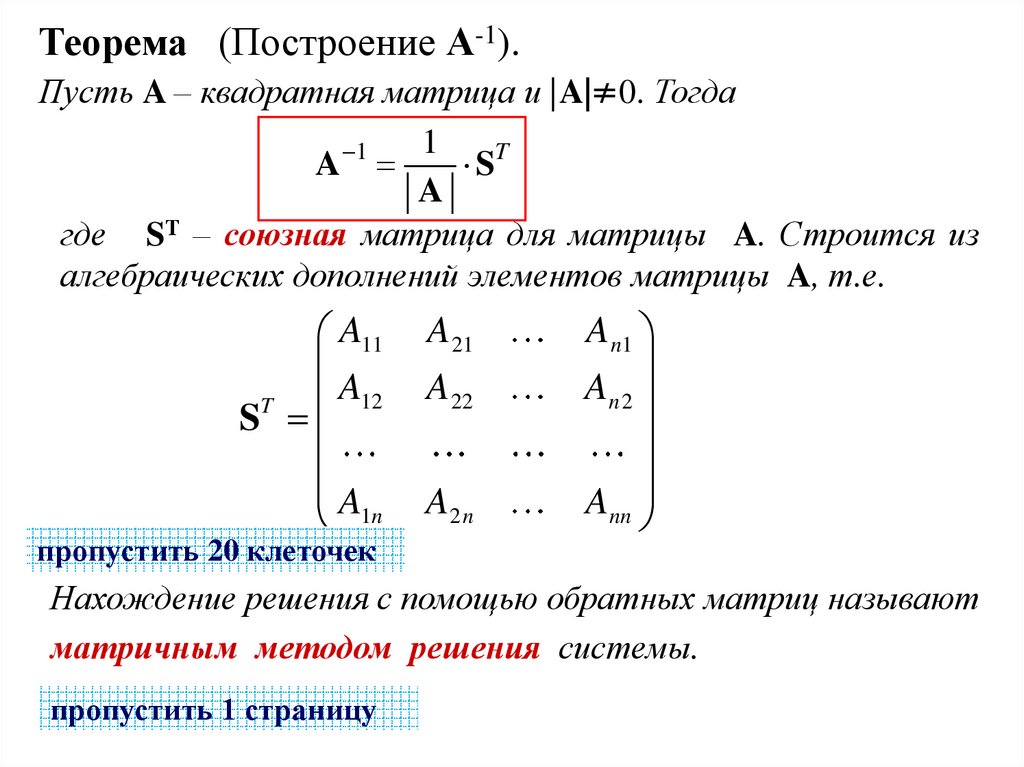 Теорема (Построение А-1).Пусть A – квадратная матрица и |A|≠0. Тогда