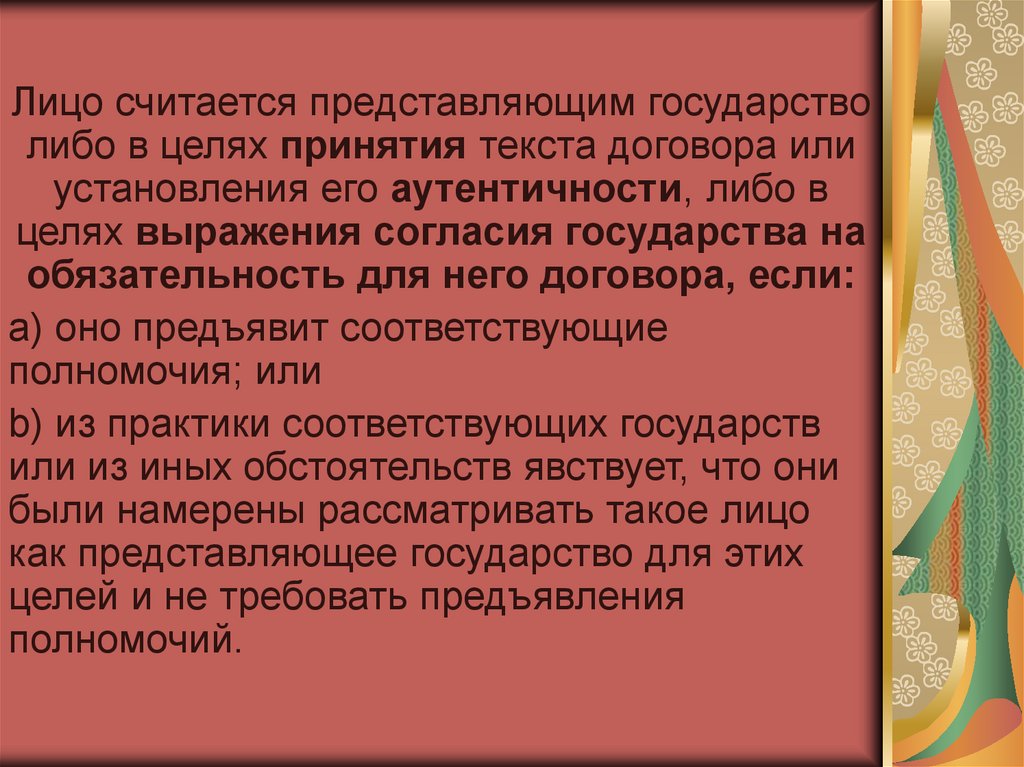 Лицо считается представляющим государстволибо в целях принятия текста договора или