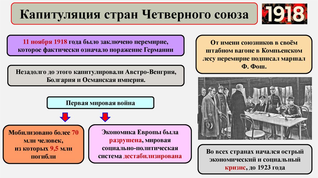 Капитуляция стран Четверного союза11 ноября 1918 года было заключено перемирие,